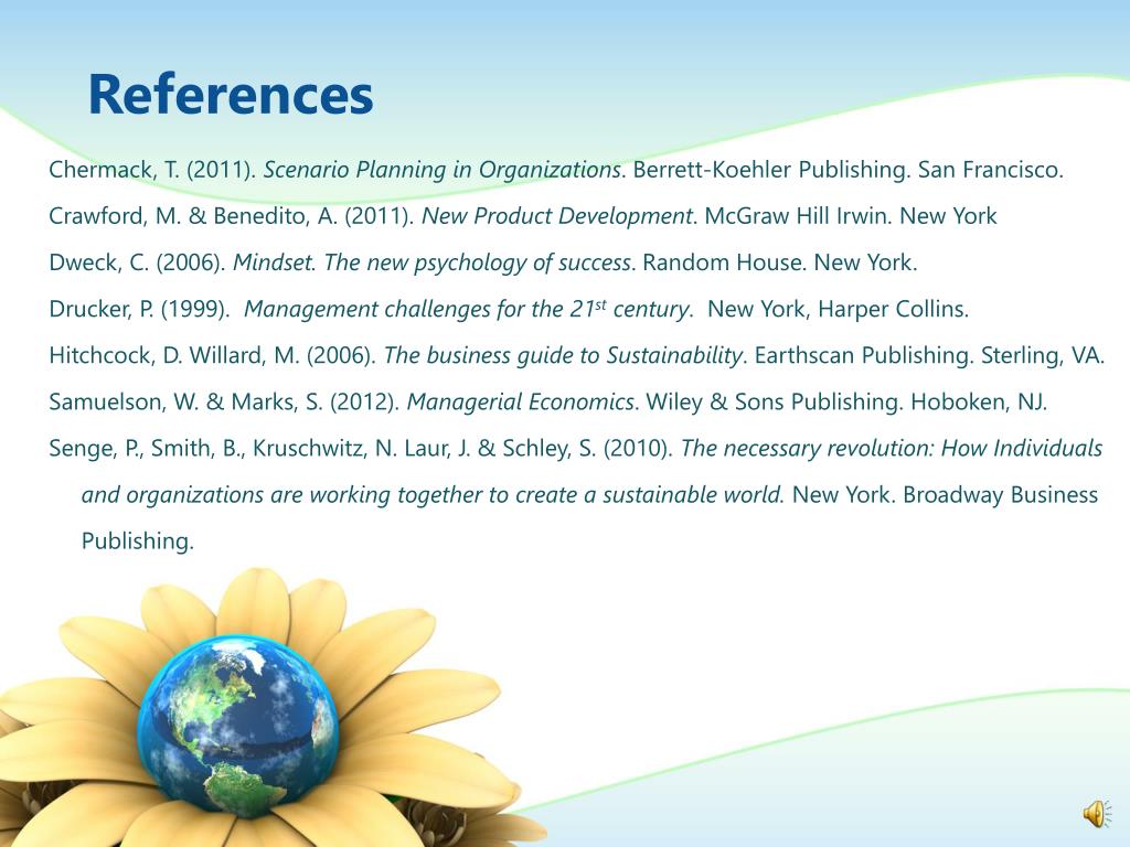References Chermack, T. (2011). Scenario Planning in Organizations. Berrett-Koehler Publishing. San Francisco. Crawford, M. & Benedito, A. (2011). New Product Development. McGraw Hill Irwin. New York Dweck, C. (2006). Mindset. The new psychology of success. Random House. New York. Drucker, P. (1999). Management challenges for the 21st century. New York, Harper Collins. Hitchcock, D. Willard, M. (2006). The business guide to Sustainability. Earthscan Publishing. Sterling, VA. Samuelson, W. & Marks, S. (2012). Managerial Economics. Wiley & Sons Publishing. Hoboken, NJ. Senge, P., Smith, B., Kruschwitz, N. Laur, J. & Schley, S. (2010). The necessary revolution: How Individuals and organizations are working together to create a sustainable world. New York. Broadway Business Publishing.
