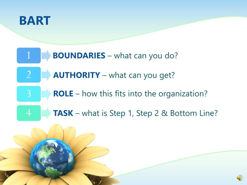 BART Boundaries – what can you do? 1 2 3 4 Authority– what can you get? Role– how this fits into the organization? Task– what is Step 1, Step 2 & Bottom Line?