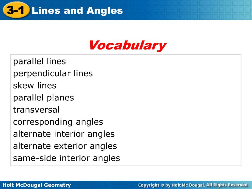 Vocabulary parallel lines perpendicular lines skew lines parallel planes transversal corresponding angles alternate interior angles alternate exterior angles same-side interior angles