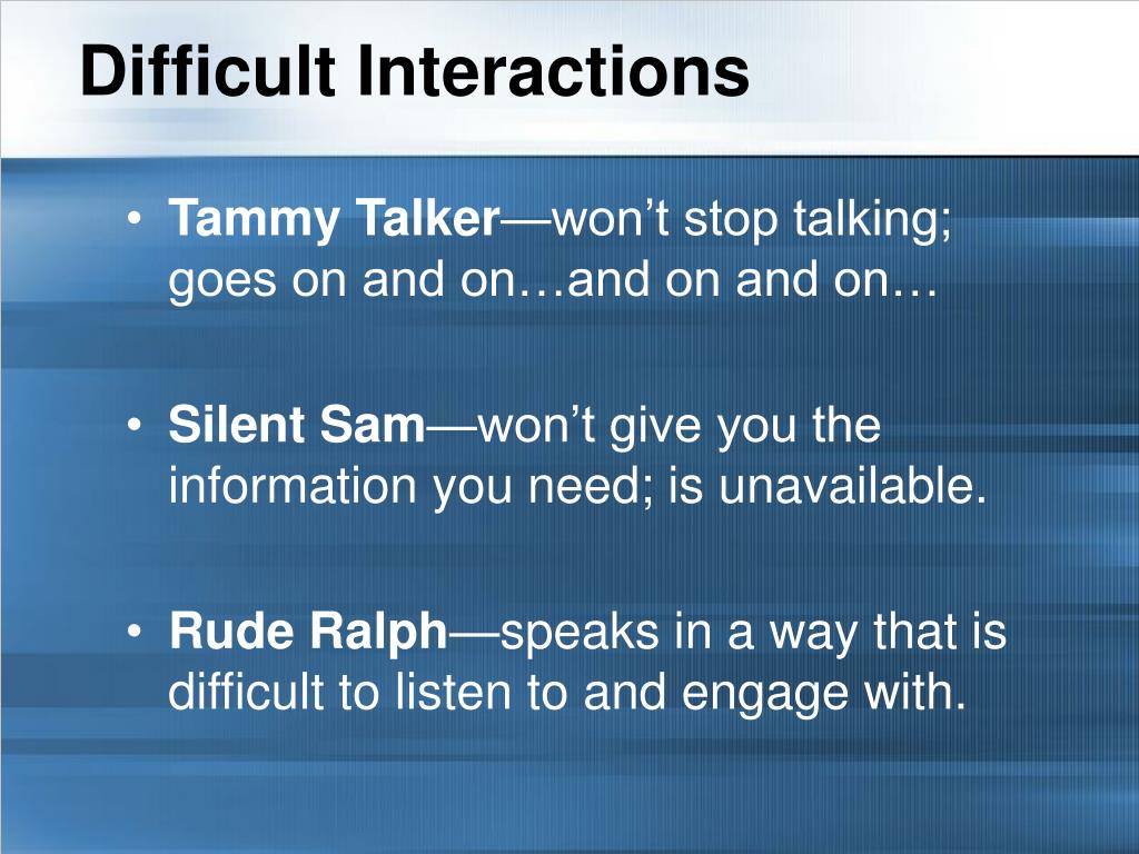 Difficult Interactions • Tammy Talker—won’t stop talking; goes on and on…and on and on… • Silent Sam—won’t give you the information you need; is unavailable. • Rude Ralph—speaks in a way that is difficult to listen to and engage with.