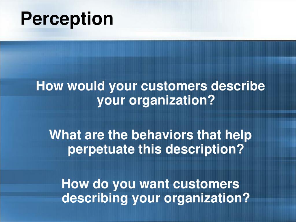 Perception How would your customers describe your organization? What are the behaviors that help perpetuate this description? How do you want customers describing your organization?