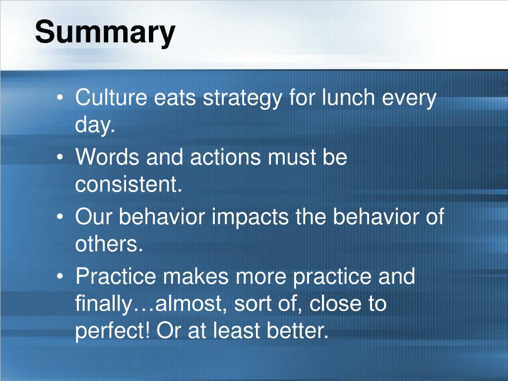 Summary • Culture eats strategy for lunch every day. • Words and actions must be consistent. • Our behavior impacts the behavior of others. • Practice makes more practice and finally…almost, sort of, close to perfect! Or at least better.