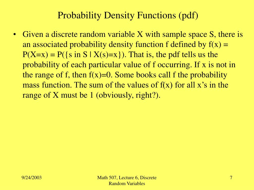 Probability Density Functions (pdf) • Given a discrete random variable X with sample space S, there is an associated probability density function f defined by f(x) = P(X=x) = P({s in S | X(s)=x}). That is, the pdf tells us the probability of each particular value of f occurring. If x is not in the range of f, then f(x)=0. Some books call f the probability mass function. The sum of the values of f(x) for all x’s in the range of X must be 1 (obviously, right?). Math 507, Lecture 6, Discrete Random Variables