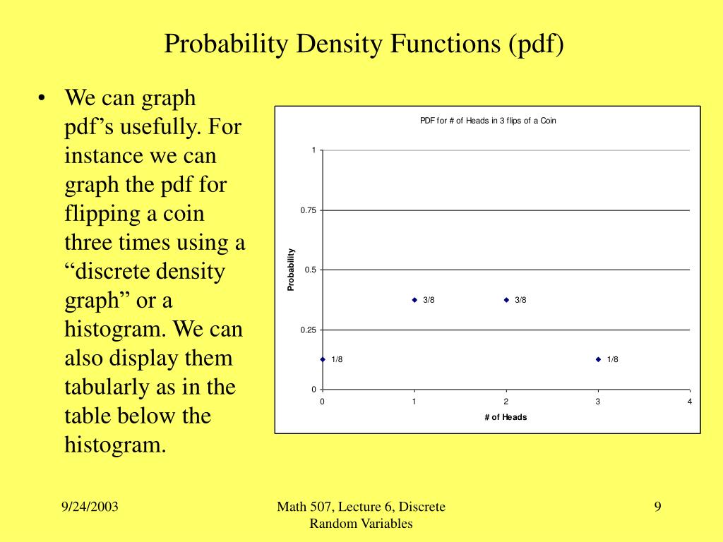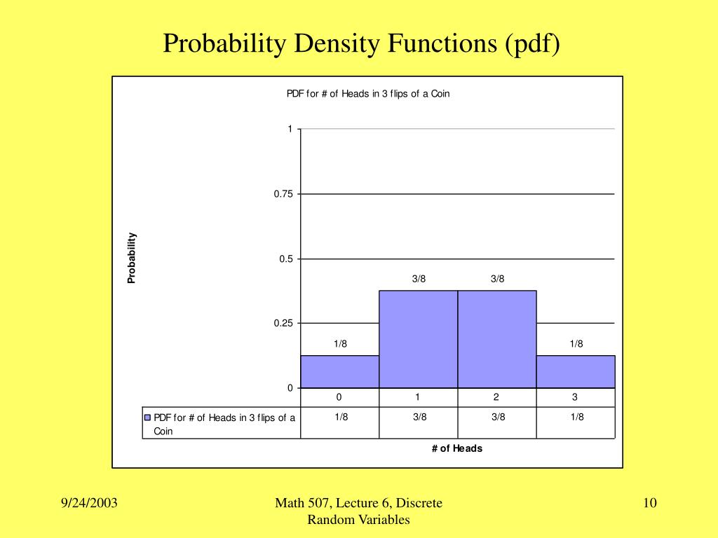 Probability Density Functions (pdf) • We can graph pdf’s usefully. For instance we can graph the pdf for flipping a coin three times using a “discrete density graph” or a histogram. We can also display them tabularly as in the table below the histogram. Math 507, Lecture 6, Discrete Random Variables