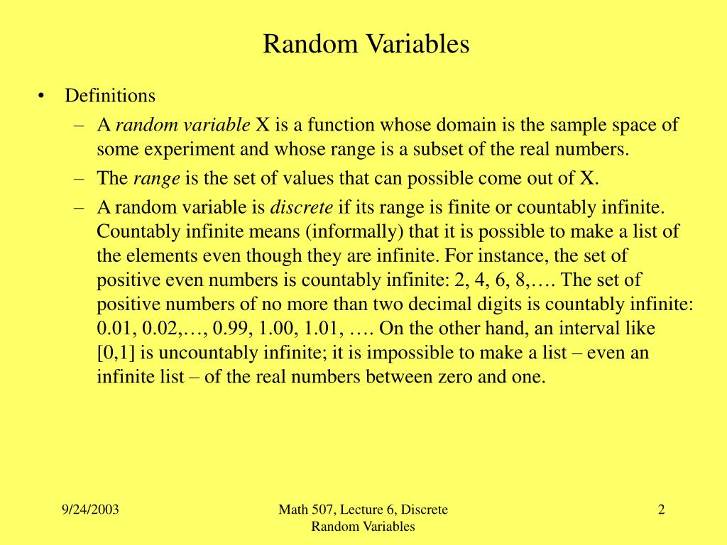 Random Variables • Definitions • A random variable X is a function whose domain is the sample space of some experiment and whose range is a subset of the real numbers. • The range is the set of values that can possible come out of X. • A random variable is discrete if its range is finite or countably infinite. Countably infinite means (informally) that it is possible to make a list of the elements even though they are infinite. For instance, the set of positive even numbers is countably infinite: 2, 4, 6, 8,…. The set of positive numbers of no more than two decimal digits is countably infinite: 0.01, 0.02,…, 0.99, 1.00, 1.01, …. On the other hand, an interval like [0,1] is uncountably infinite; it is impossible to make a list – even an infinite list – of the real numbers between zero and one. Math 507, Lecture 6, Discrete Random Variables