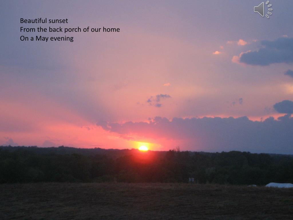 Ashley’s Photoku. Beautiful sunset From the back porch of our home On a May evening. Start praying for rain G rowing corn means spring is here Summer is coming. Clouds will bring the rain Don’t worry about the storm Just enjoy the view. Colorful scenery God’s promise of better days