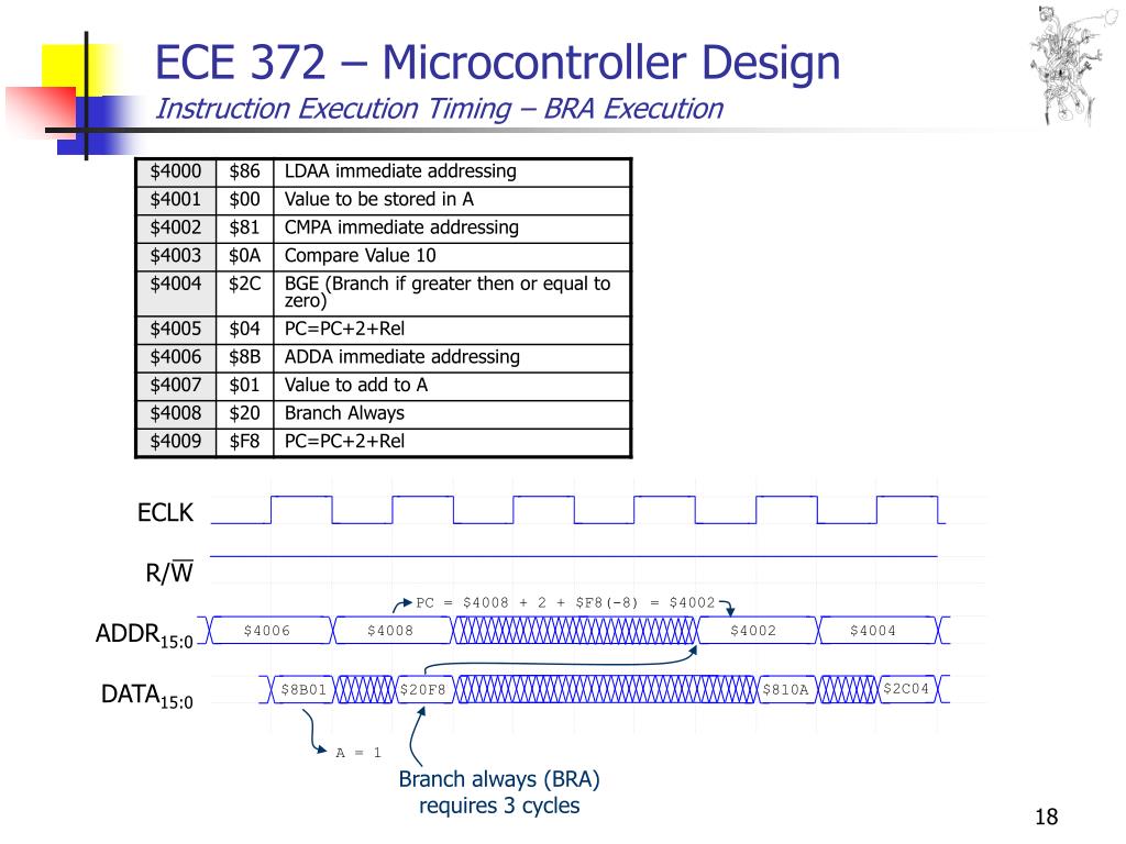 ECLK R/W ADDR15:0 DATA15:0 PC = $4008 + 2 + $F8(-8) = $4002 A = 1 Branch always (BRA) requires 3 cycles ECE 372 – Microcontroller DesignInstruction Execution Timing – BRA Execution $4006 $4008 $4002 $4004 $2C04 $8B01 $20F8 $810A