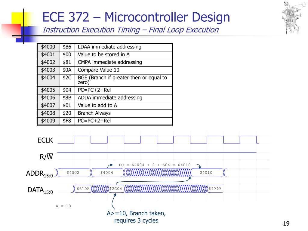 ECLK R/W ADDR15:0 DATA15:0 PC = $4004 + 2 + $04 = $4010 A>=10, Branch taken, requires 3 cycles ECE 372 – Microcontroller DesignInstruction Execution Timing – Final Loop Execution $4002 $4004 $4010 $810A $2C04 $???? A = 10
