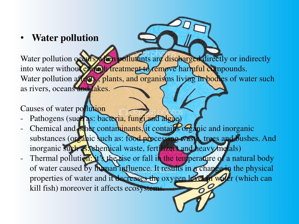 Water pollution • Water pollution occurs when pollutants are discharged directly or indirectly into water without enough treatment to remove harmful compounds. • Water pollution affects , plants, and organisms living in bodies of water such as rivers, oceans and lakes. • Causes of water pollution • Pathogens (such as: bacteria, fungi and algae) • Chemical and other contaminants, it contains organic and inorganic substances (organic such as: food processing waste, trees and bushes. And inorganic such as: chemical waste, fertilizers and heavy metals) • Thermal pollution: it’s the rise or fall in the temperature of a natural body of water caused by human influence. It results in a change in the physical properties of water and it decreases the oxygen level in water (which can kill fish) moreover it affects ecosystems.