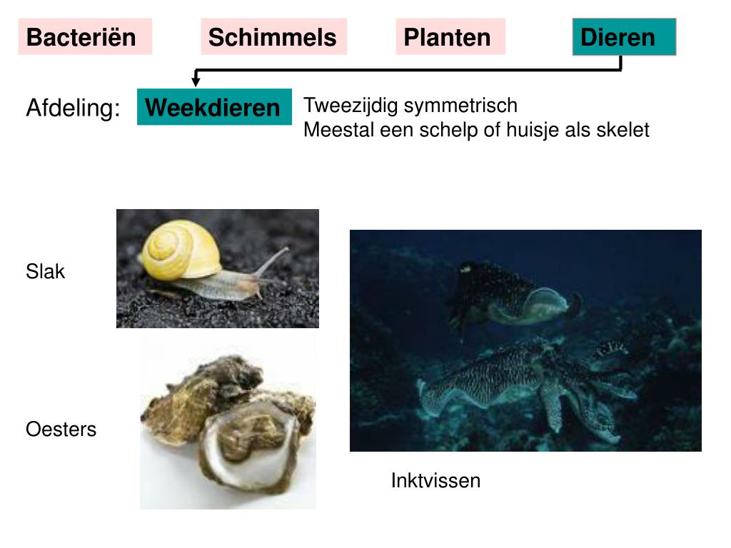Bacteriën Schimmels Planten Dieren Afdeling: Weekdieren Tweezijdig symmetrisch Meestal een schelp of huisje als skelet Slak Oesters Inktvissen