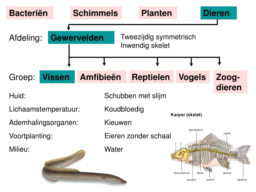 Bacteriën Schimmels Planten Dieren Afdeling: Gewervelden Tweezijdig symmetrischInwendig skelet Groep: Vissen Amfibieën Reptielen Vogels Zoog-dieren Huid: Schubben met slijm Lichaamstemperatuur: Koudbloedig Ademhalingsorganen: Kieuwen Voortplanting: Eieren zonder schaal Milieu: Water