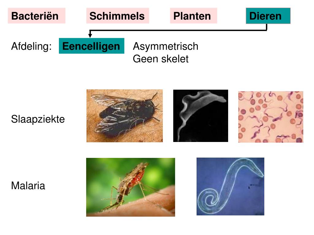 Bacteriën Schimmels Planten Dieren Afdeling: Eencelligen AsymmetrischGeen skelet Slaapziekte Malaria