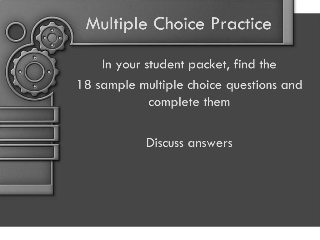 Multiple Choice Practice In your student packet, find the 18 sample multiple choice questions and complete them Discuss answers