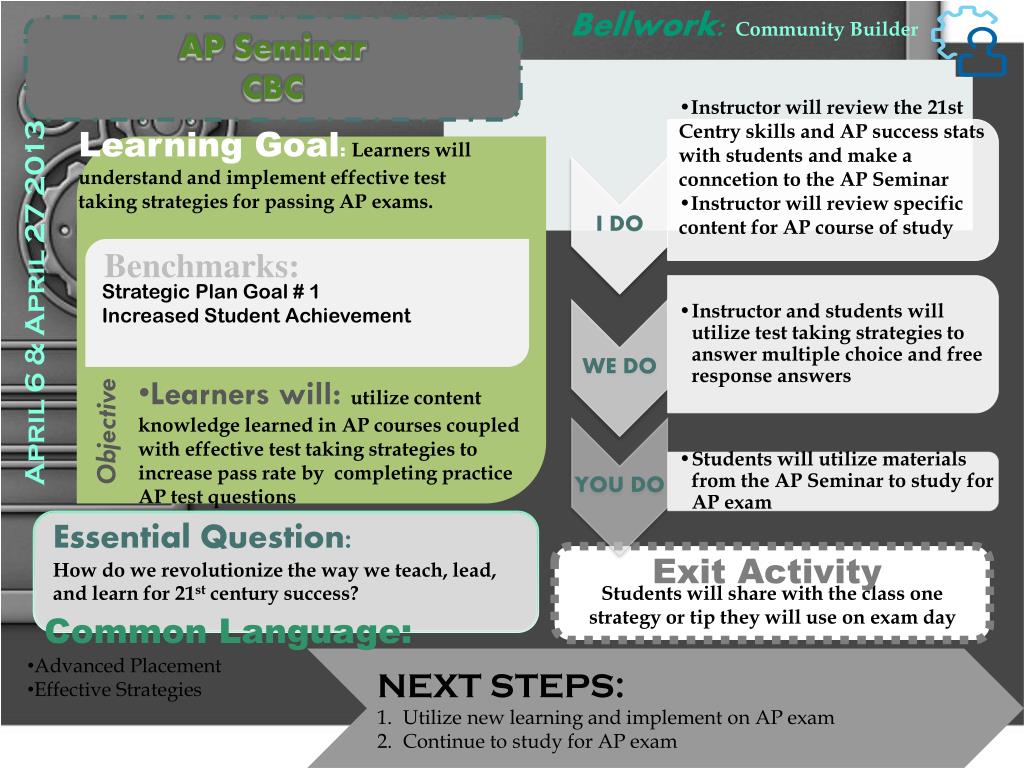 Bellwork: Community Builder AP Seminar CBC Learning Goal: Learners will understand and implement effective test taking strategies for passing AP exams. Strategic Plan Goal # 1 Increased Student Achievement Benchmarks: April 6 & April 27 2013 • Learners will: utilize content knowledge learned in AP courses coupled with effective test taking strategies to increase pass rate by completing practice AP test questions Objective Essential Question: How do we revolutionize the way we teach, lead, and learn for 21st century success? Students will share with the class one strategy or tip they will use on exam day Exit Activity Common Language: • Advanced Placement • Effective Strategies NEXT STEPS: Utilize new learning and implement on AP exam Continue to study for AP exam