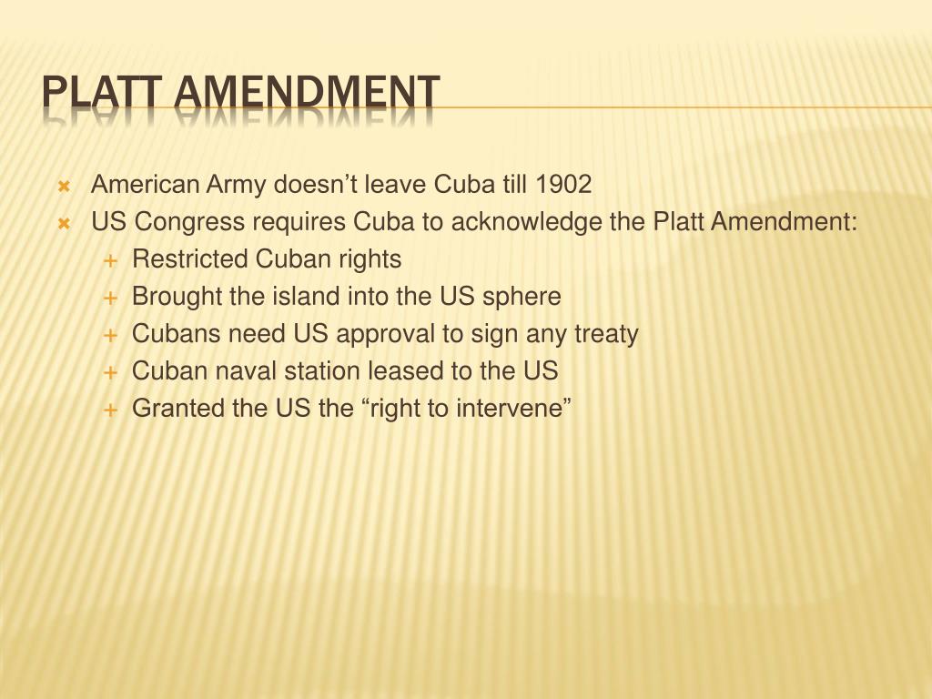 American Army doesn’t leave Cuba till 1902 • US Congress requires Cuba to acknowledge the Platt Amendment: • Restricted Cuban rights • Brought the island into the US sphere • Cubans need US approval to sign any treaty • Cuban naval station leased to the US • Granted the US the “right to intervene” Platt Amendment