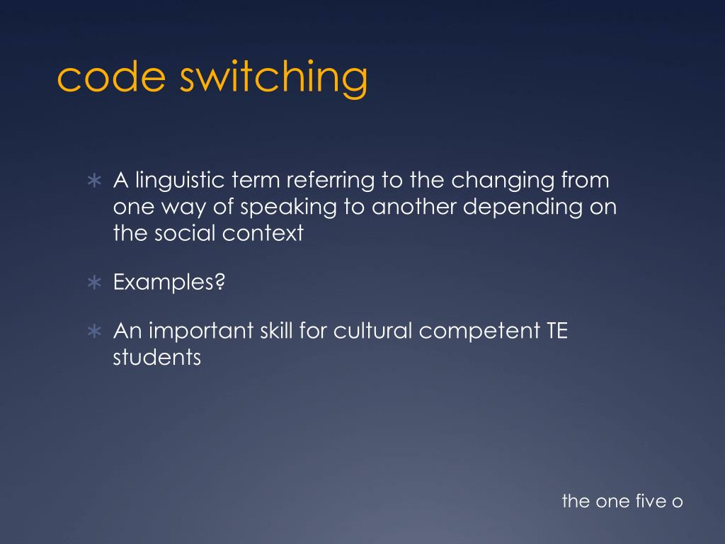 code switching • A linguistic term referring to the changing from one way of speaking to another depending on the social context • Examples? • An important skill for cultural competent TE students the one five o