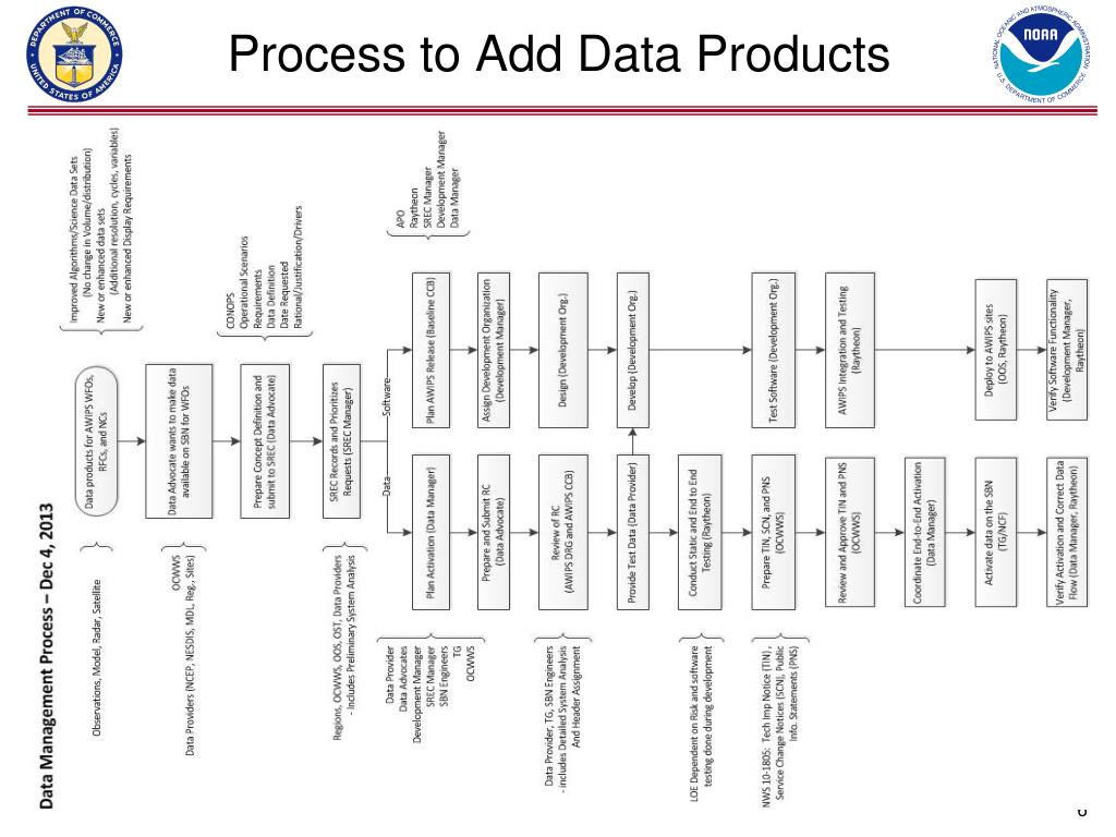 Data Management Team • Data Manager • POC: Dave Niver (Raytheon) • Data Provider • POCs: NCEP (Rebecca Cosgrove), NESDIS (John Paquette), MDL (Kathryn Gilbert), NSSL (TBD), GSD (Woody Roberts), Radar (Mike Istok), regional and local data product providers. • Data Advocate • POC: Data Provider, OCWWS (Cindy Woods), Region and Site personnel • SREC Manager • POC: Robert Rood (OST/SEC/Development Branch) • Development Manager • POC: Ana Rivera (OST/SEC/Development Branch) • APO/Baseline Configuration Control Board (BCCB) • POC: Steve Schotz(OST/PPD/Program Management Branch • OCWWS/TINs, SCNs, PNSs • POC: Michael Baker (OCWWS) 7