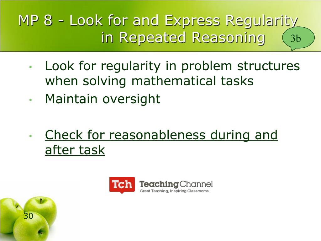 MP 8 - Look for and Express Regularity in Repeated Reasoning 3b • Look for regularity in problem structures when solving mathematical tasks • Maintain oversight • Check for reasonableness during and after task