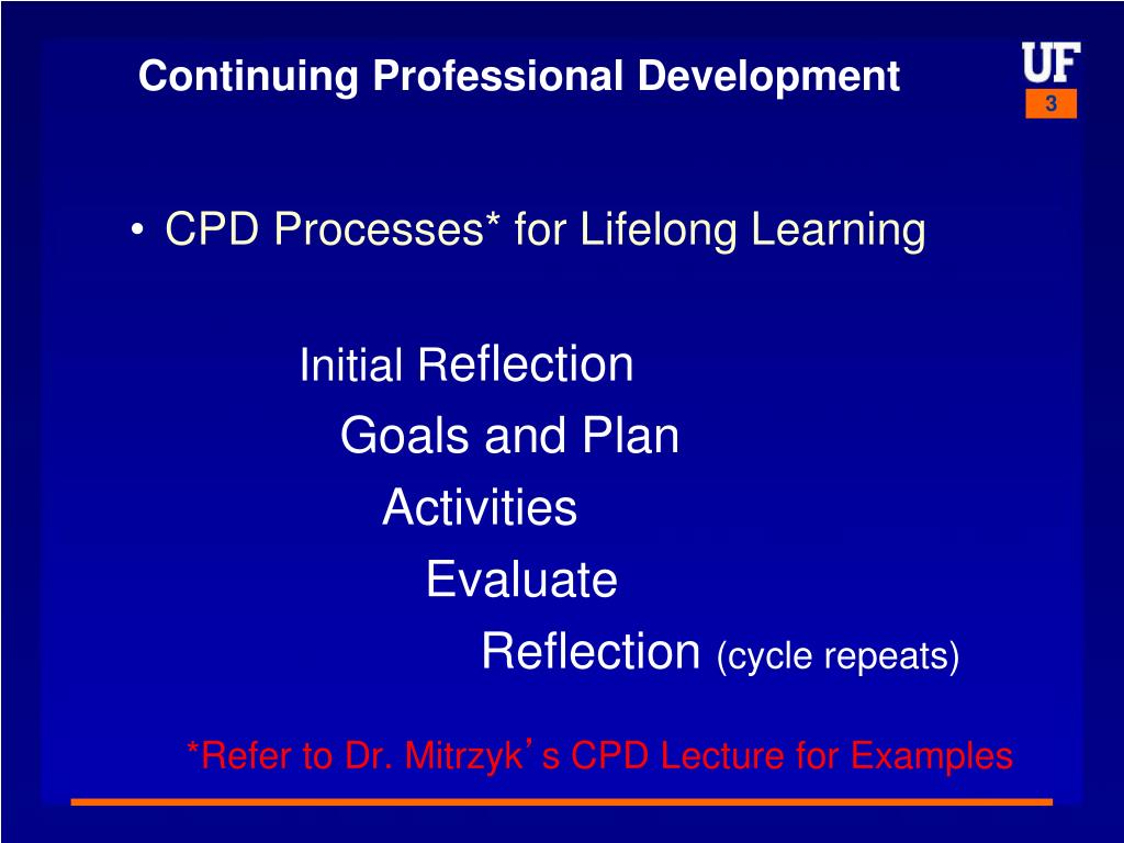 Continuing Professional Development • CPD Processes* for Lifelong Learning Initial Reflection Goals and Plan Activities Evaluate Reflection (cycle repeats) *Refer to Dr. Mitrzyk’s CPD Lecture for Examples