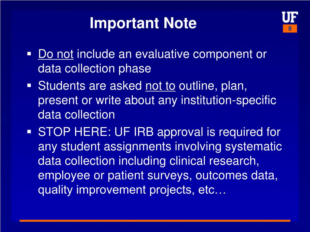 Important Note • Do not include an evaluative component or data collection phase • Students are asked not to outline, plan, present or write about any institution-specific data collection • STOP HERE: UF IRB approval is required for any student assignments involving systematic data collection including clinical research, employee or patient surveys, outcomes data, quality improvement projects, etc…
