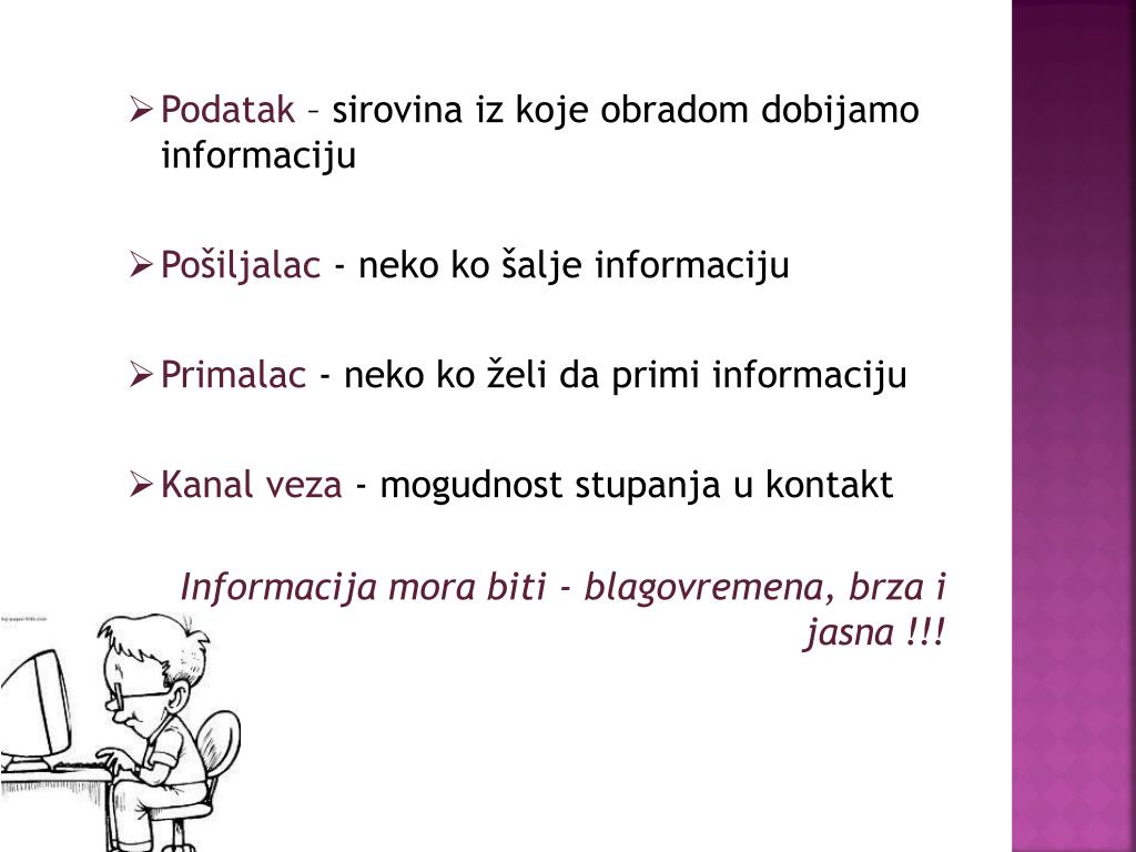 Podatak – sirovina iz koje obradom dobijamo informaciju • Pošiljalac - nekokošaljeinformaciju • Primalac - neko ko želi da primi informaciju • Kanal veza - mogudnost stupanja u kontakt Informacija mora biti - blagovremena, brza i jasna !!!