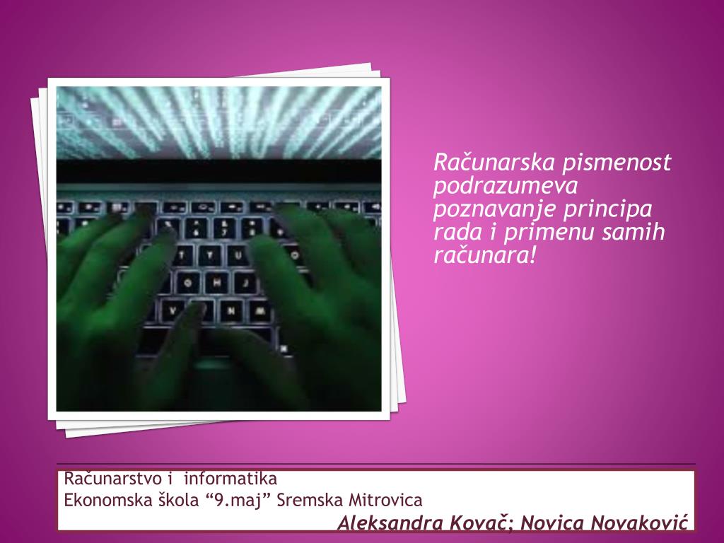 Računarskapismenostpodrazumevapoznavanjeprinciparadaiprimenusamihračunara!Računarskapismenostpodrazumevapoznavanjeprinciparadaiprimenusamihračunara! Računarstvo i informatika Ekonomska škola “9.maj” Sremska Mitrovica Aleksandra Kovač; Novica Novaković