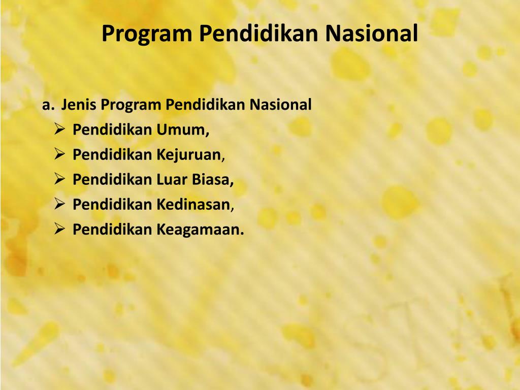 Program Pendidikan Nasional • Jenis Program PendidikanNasional • PendidikanUmum, • PendidikanKejuruan, • PendidikanLuarBiasa, • PendidikanKedinasan, • PendidikanKeagamaan.