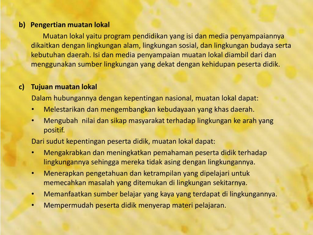 KurikulumMuatanLokal • Latarbelakang Kenyataanmenunjukkanbahwasetiapdaerah Indonesia memilikicirikhasmengenaiadatistiadat, tatacaradantatakramapergaulan, kesenian, bahasa (lisanmaupuntulisan), kerajinan, dannilai-nilaikehidupannyamasing-masing. Olehkarenaitu, keanekaragamancirikhasdaerahperludilestarikandandikembangkanmelaluiupayapendidikan yang nantinyaakanmemeliharajalinanantarasekolahdenganlingkungannya. Dan dalampengembangankurikulumsekolah, daerahperludilibatkan, agar sekolahberkesempatanmenyusun program muatanlokal yang sesuaiuntuklingkungannya. Kesungguhanpemerintahdalammerealisasikanpemikiranmengenaimuatanlokaltersebut, yang dimulaipadasekolahdasar, diwujudkandalamKeputusanMenteriPendidikandanKebudayaan RI No. 0412/U/1987 Tanggal 11 Juli 1987 tentangPenerapanMuatanLokalSekolahDasar. KemudiandisusuldenganpenjabaranpelaksanaanyadalamkeputusanDirekturJenderalPendidikanDasardanMenengah No. 173/C/Kep/87 Tanggal 7 Oktober 1987.