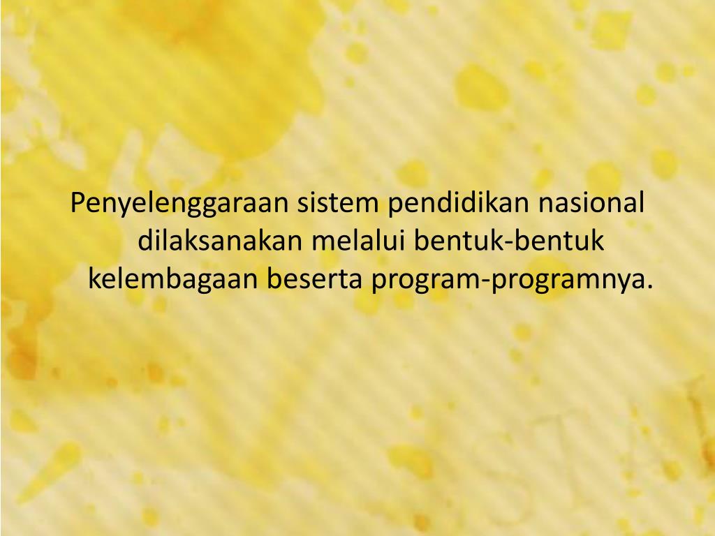 Penyelenggaraan sistem pendidikan nasional dilaksanakan melalui bentuk-bentuk kelembagaan beserta program-programnya.