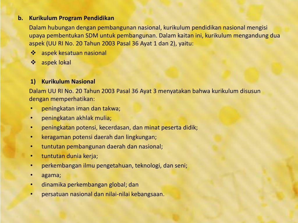 Kurikulum Program Pendidikan Dalamhubungandenganpembangunannasional, kurikulumpendidikannasionalmengisiupayapembentukan SDM untukpembangunan. Dalamkaitanini, kurikulummengandungduaaspek (UU RI No. 20 Tahun 2003 Pasal 36 Ayat 1 dan 2), yaitu: • aspekkesatuannasional • aspeklokal • KurikulumNasional Dalam UU RI No. 20 Tahun 2003 Pasal 36 Ayat 3 menyatakanbahwakurikulumdisusundenganmemperhatikan: • peningkatanimandantakwa; • peningkatan akhlak mulia; • peningkatan potensi, kecerdasan, dan minat peserta didik; • keragaman potensi daerah dan lingkungan; • tuntutan pembangunan daerah dan nasional; • tuntutan dunia kerja; • perkembangan ilmu pengetahuan, teknologi, dan seni; • agama; • dinamika perkembangan global; dan • persatuannasionaldannilai-nilaikebangsaan.