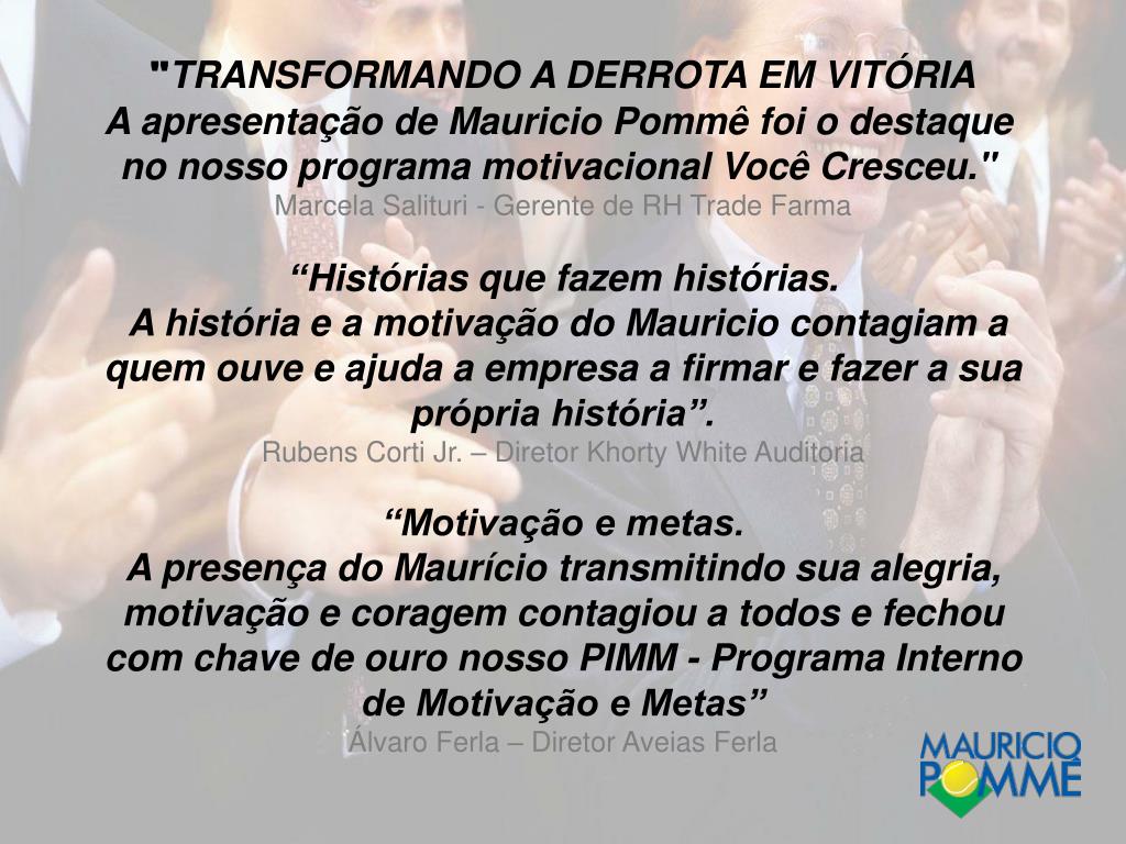 "TRANSFORMANDO A DERROTA EM VITÓRIA A apresentação de Mauricio Pommê foi o destaque no nosso programa motivacional Você Cresceu." Marcela Salituri - Gerente de RH Trade Farma “Motivação e metas.A presença do Maurício transmitindo sua alegria, motivação e coragem contagiou a todos e fechou com chave de ouro nosso PIMM - Programa Interno de Motivação e Metas”Álvaro Ferla – Diretor Aveias Ferla “Histórias que fazem histórias. A história e a motivação do Mauricio contagiam a quem ouve e ajuda a empresa a firmar e fazer a sua própria história”.Rubens Corti Jr. – Diretor Khorty White Auditoria