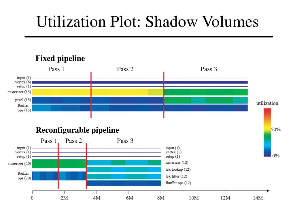 Utilization Plot: Shadow Volumes Fixed pipeline Pass 1 Pass 2 Pass 3 Reconfigurable pipeline Pass 1 Pass 2 Pass 3