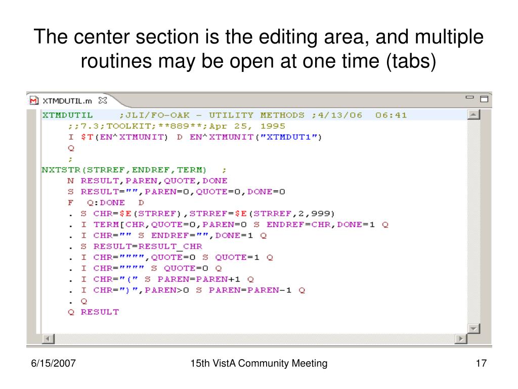 The center section is the editing area, and multiple routines may be open at one time (tabs) 15th VistA Community Meeting