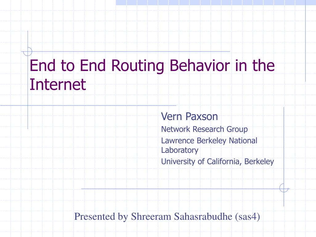 End to End Routing Behavior in the Internet Vern Paxson Network Research Group Lawrence Berkeley National Laboratory University of California, Berkeley Presented by Shreeram Sahasrabudhe (sas4)