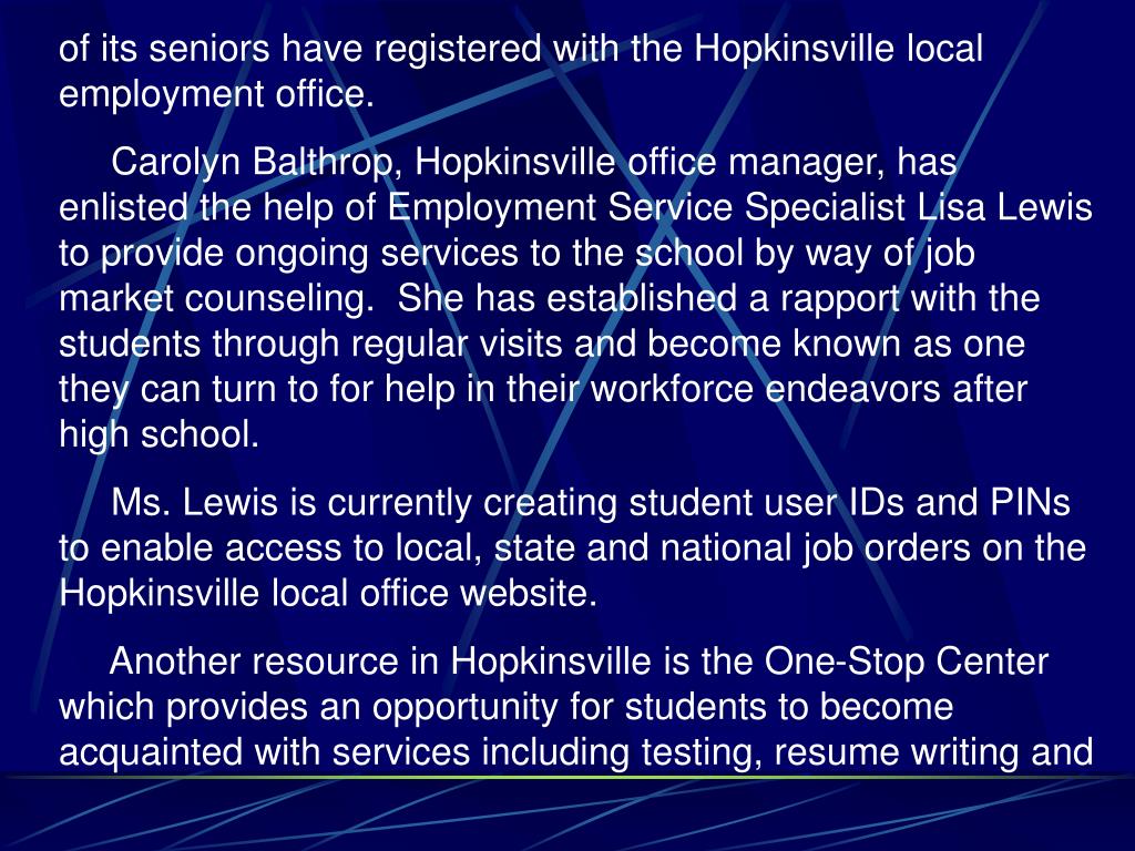 of its seniors have registered with the Hopkinsville local employment office. Carolyn Balthrop, Hopkinsville office manager, has enlisted the help of Employment Service Specialist Lisa Lewis to provide ongoing services to the school by way of job market counseling. She has established a rapport with the students through regular visits and become known as one they can turn to for help in their workforce endeavors after high school. Ms. Lewis is currently creating student user IDs and PINs to enable access to local, state and national job orders on the Hopkinsville local office website. Another resource in Hopkinsville is the One-Stop Center which provides an opportunity for students to become acquainted with services including testing, resume writing and