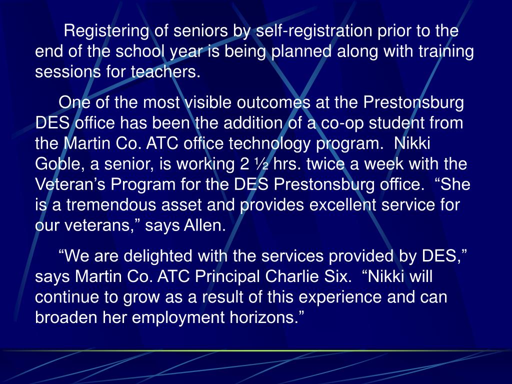 application assistance. As seniors identify job opportunities and share their desire to interview with the local office, DES will provide them with job referrals. “This help from Ms. Lewis and DES is just what our students need to prepare for getting a job or furthering their education,” said Arthur Dunn, Caldwell Co. ATC principal. “We also plan to provide registration opportunities for the remaining seniors in the near future.” Mr. Dunn plans presentations with Ms. Lewis on interviewing and employability skills. The Hopkinsville office has certainly been a leader in the implementation of the DES/DTE partnership, but local offices from all over the state have been reporting marked progress in their efforts as well.