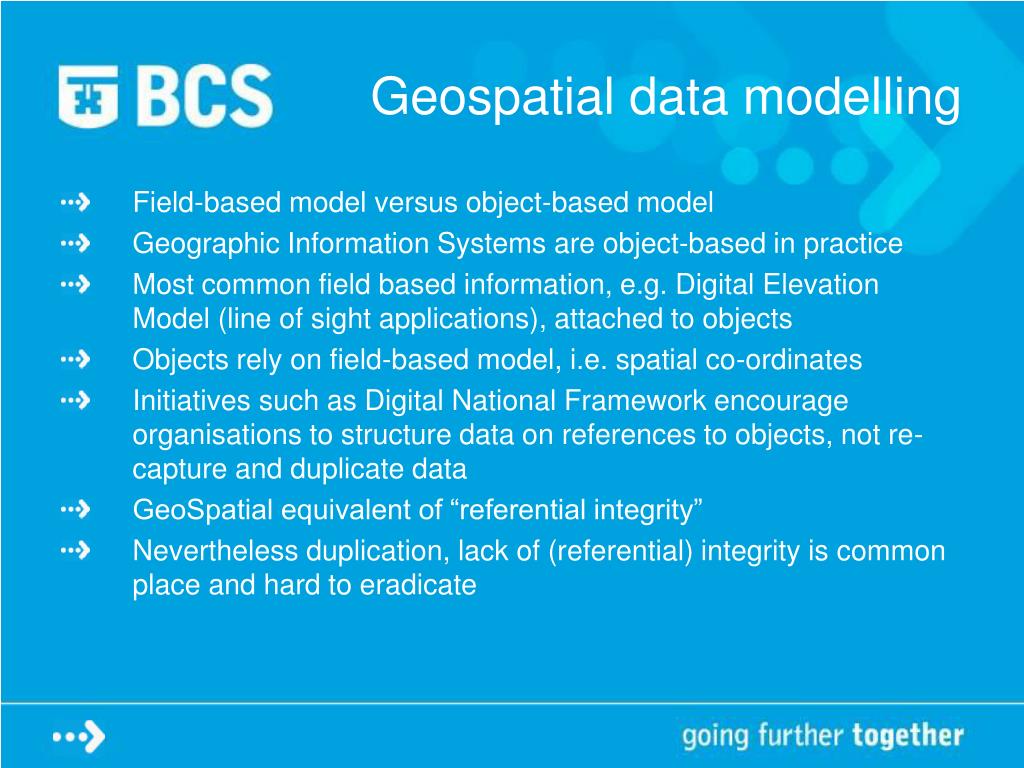 Geospatial data modelling • Field-based model versus object-based model • Geographic Information Systems are object-based in practice • Most common field based information, e.g. Digital Elevation Model (line of sight applications), attached to objects • Objects rely on field-based model, i.e. spatial co-ordinates • Initiatives such as Digital National Framework encourage organisations to structure data on references to objects, not re-capture and duplicate data • GeoSpatial equivalent of “referential integrity” • Nevertheless duplication, lack of (referential) integrity is common place and hard to eradicate