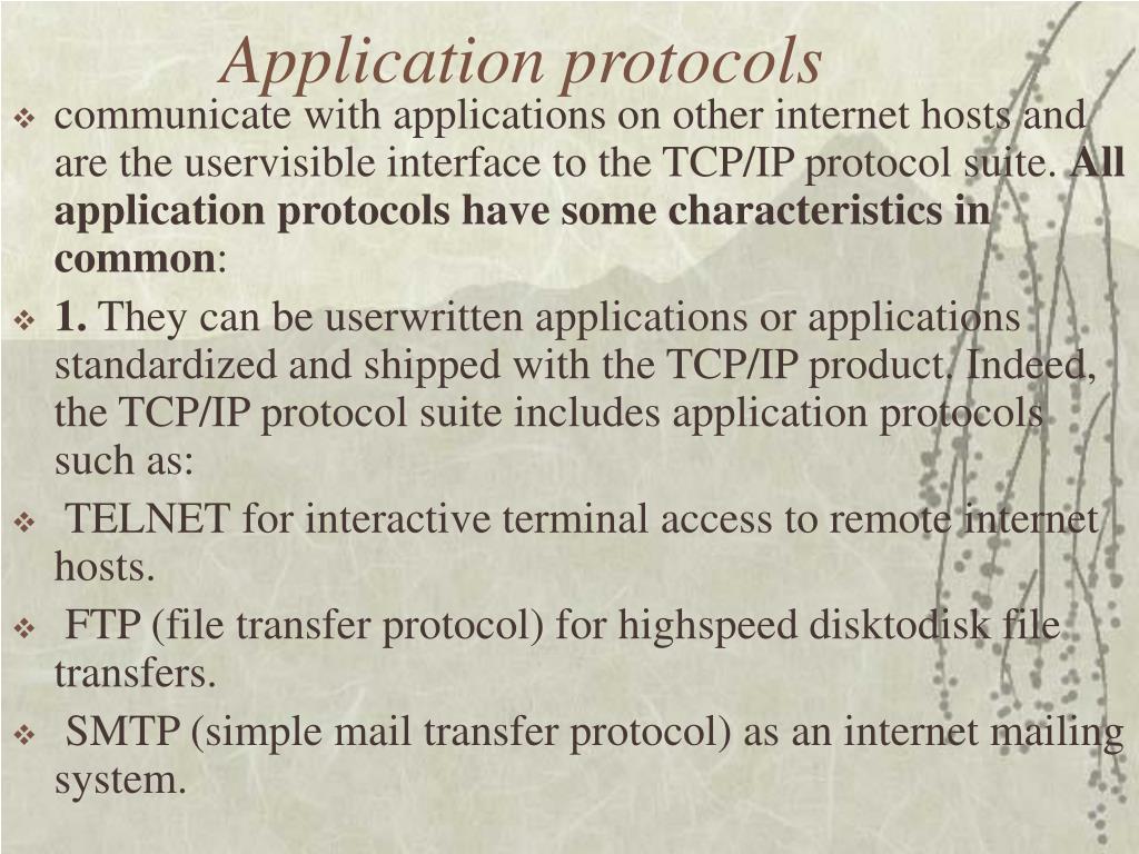 Application protocols • communicate with applications on other internet hosts and are the uservisible interface to the TCP/IP protocol suite. All application protocols have some characteristics in common: • 1. They can be userwritten applications or applications standardized and shipped with the TCP/IP product. Indeed, the TCP/IP protocol suite includes application protocols such as: • TELNET for interactive terminal access to remote internet hosts. • FTP (file transfer protocol) for highspeed disktodisk file transfers. • SMTP (simple mail transfer protocol) as an internet mailing system.