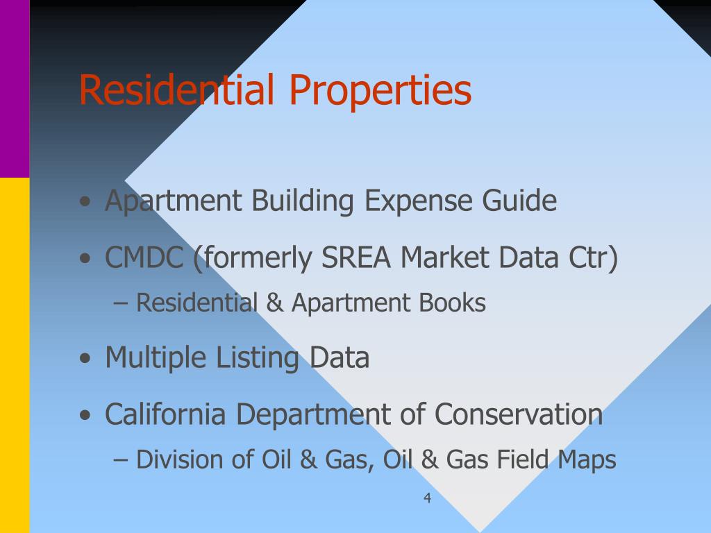 Residential Properties • Apartment Building Expense Guide • CMDC (formerly SREA Market Data Ctr) • Residential & Apartment Books • Multiple Listing Data • California Department of Conservation • Division of Oil & Gas, Oil & Gas Field Maps
