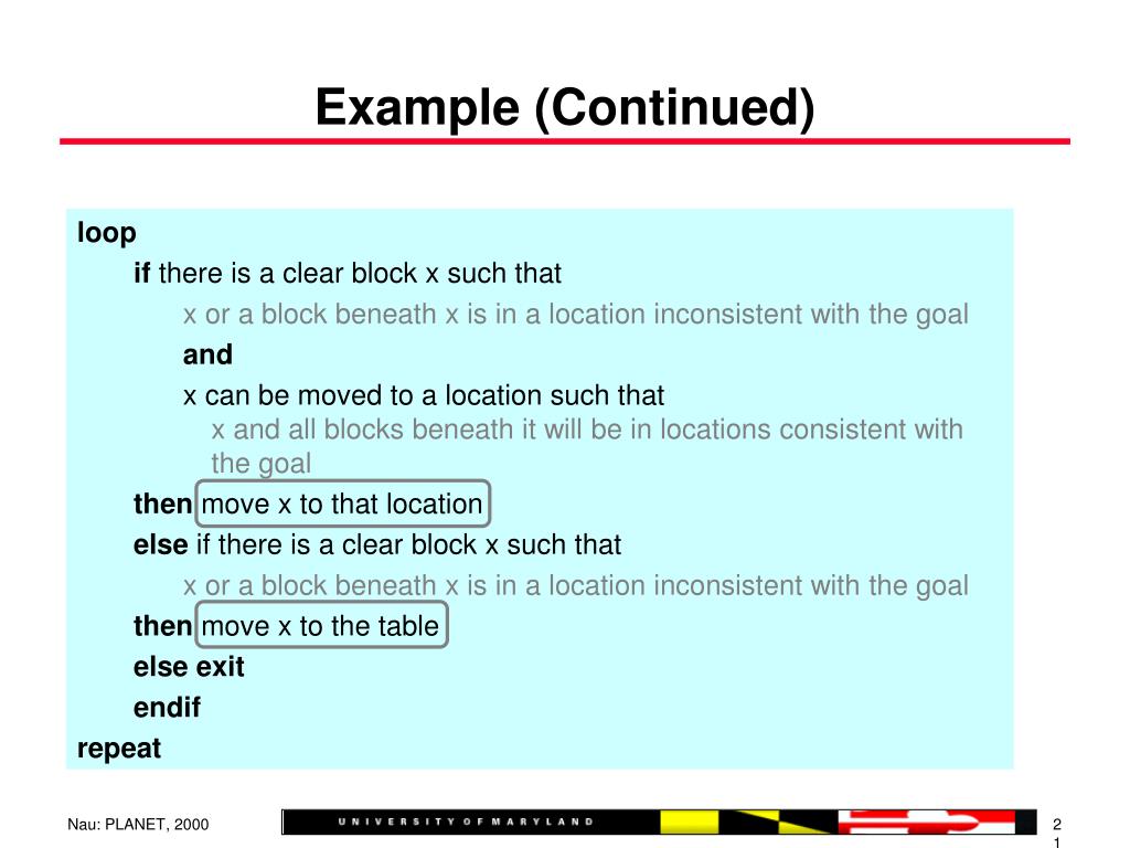 Example (Continued) loop if there is a clear block x such that x or a block beneath x is in a location inconsistent with the goal and x can be moved to a location such thatx and all blocks beneath it will be in locations consistent with the goal then move x to that location else if there is a clear block x such that x or a block beneath x is in a location inconsistent with the goal then move x to the table else exit endif repeat