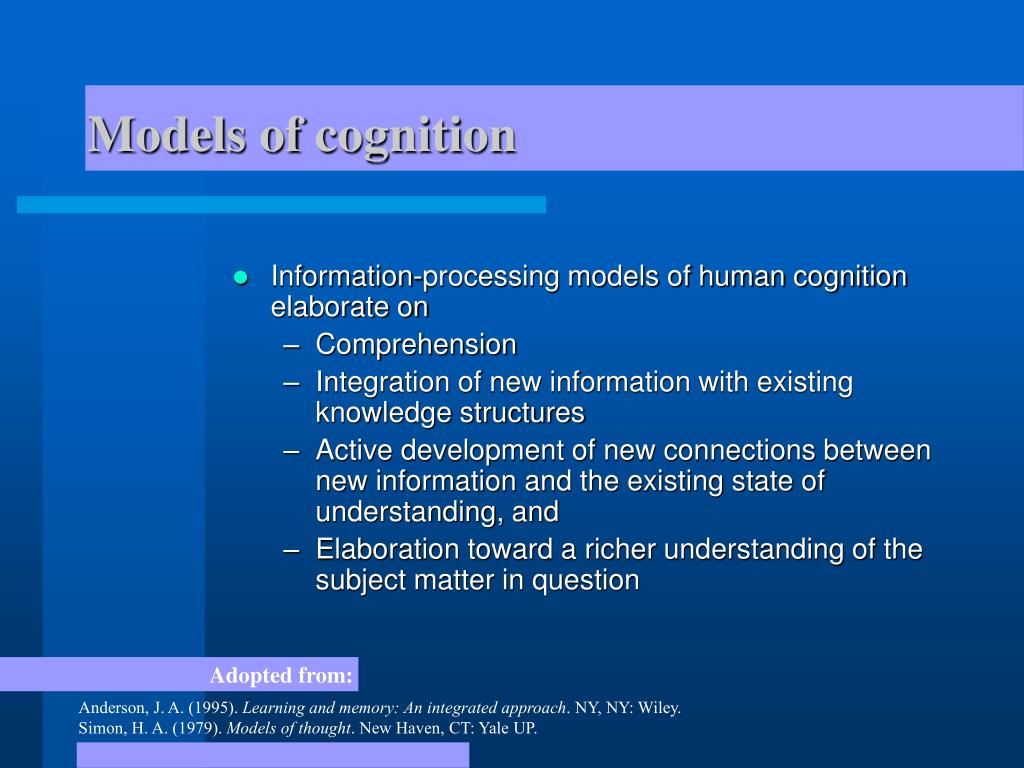 Models of cognition • Information-processing models of human cognition elaborate on • Comprehension • Integration of new information with existing knowledge structures • Active development of new connections between new information and the existing state of understanding, and • Elaboration toward a richer understanding of the subject matter in question Adopted from: Anderson, J. A. (1995). Learning and memory: An integrated approach. NY, NY: Wiley. Simon, H. A. (1979). Models of thought. New Haven, CT: Yale UP.
