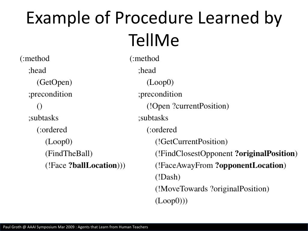 Instructions that TellMe Can Process // Stop and move back to your previous position (e.g. cut back). 11: doThis name=MoveTowards 12: basedOnoriginalPosition expect=currentPosition // If you are not open, do this again. 13: until 14: name=Open basedOncurrentPosition // Once your open, find the ball and face it. 15: doThis name=FindTheBall expect=ballLocation 16: name=ballLocationisa type=Position 17: doThis name=Face basedOnballLocation 18: end 1: begin lesson 2: start GetOpenhasId 8888 3: repeat // Find your closest opponent. 4: doThis name=GetCurrentPosition expect originalPosition 5: name=originalPositionisa type=Position 6: doThis name=FindClosestOpponent basedOn=originalPosition expect=opponentLocation // Dash away from them 7: name=opponentLocationisa type=Position 8: doThis name=FaceAwayFrom basedOnopponentLocation 9: doThis name=Dash expect=currentPosition 10: name=currentPositionisa type=Position