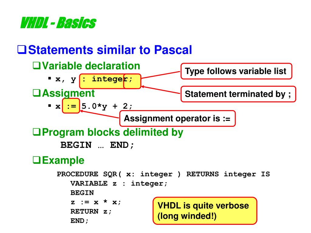 Type follows variable list Assignment operator is := Statement terminated by ; VHDL - Basics • Statements similar to Pascal • Variable declaration • x, y : integer; • Assigment • x := 5.0*y + 2; • Program blocks delimited by BEGIN … END; • Example • PROCEDURE SQR( x: integer ) RETURNS integer IS VARIABLE z : integer; BEGIN • z := x * x; • RETURN z; END; VHDL is quite verbose (long winded!)