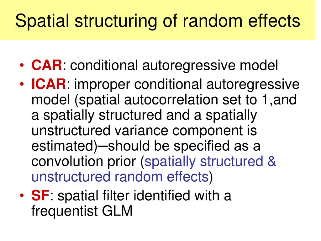 Spatial structuring of random effects • CAR: conditional autoregressive model • ICAR: improper conditional autoregressive model (spatial autocorrelation set to 1,and a spatially structured and a spatially unstructured variance component is estimated)─should be specified as a convolution prior (spatially structured & unstructured random effects) • SF: spatial filter identified with a frequentist GLM