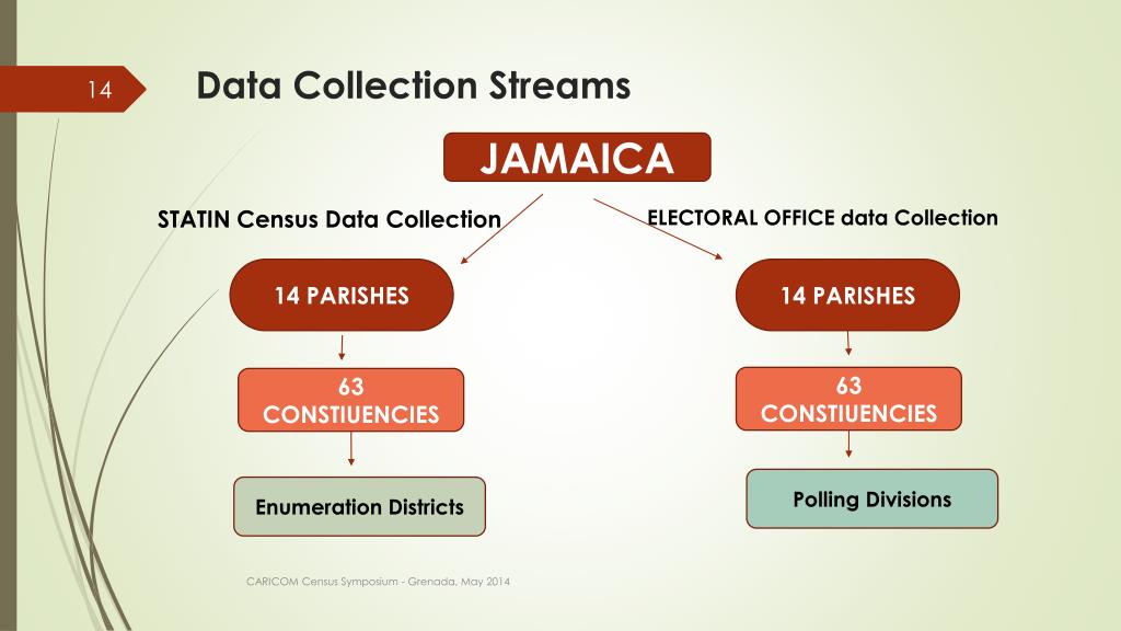 Data Collection Streams JAMAICA STATIN Census Data Collection ELECTORAL OFFICE data Collection 14 PARISHES 14 PARISHES 63 CONSTIUENCIES 63 CONSTIUENCIES Polling Divisions Enumeration Districts CARICOM Census Symposium - Grenada, May 2014