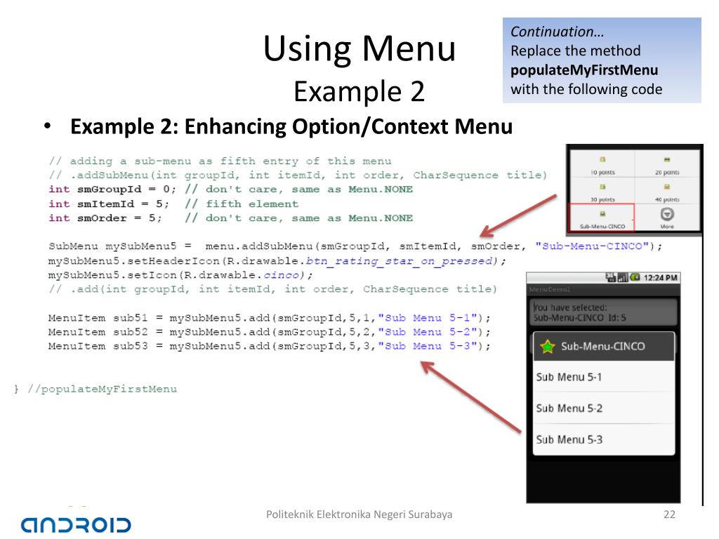 Using MenuExample 2 Replace the method populateMyFirstMenu with the following code • Example 2: Enhancing Option/Context Menu Politeknik Elektronika Negeri Surabaya