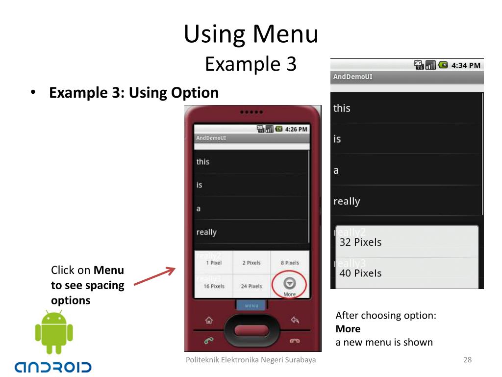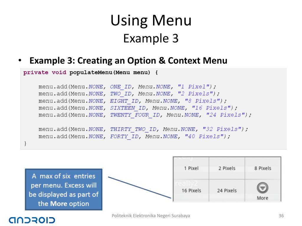 Using Menus Comments on Creating Option Menu • Pressing the hardware Menubutton on the device. Implement onCreateOptionMenu(…) • To find out when a option menu choice was chosen, implement onOptionItemSelected() on the activity. Politeknik Elektronika Negeri Surabaya