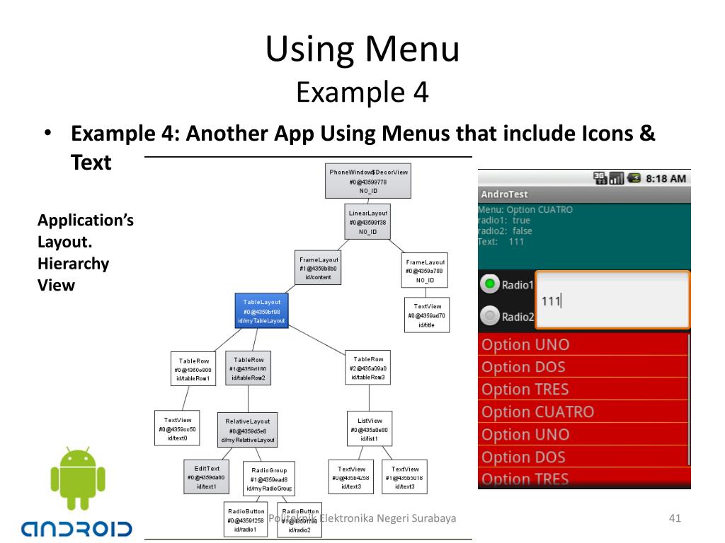 Using MenuExample 4 • Example 4: Another App Using Menus that include Icons & Text Application’s Layout. Hierarchy View Politeknik Elektronika Negeri Surabaya