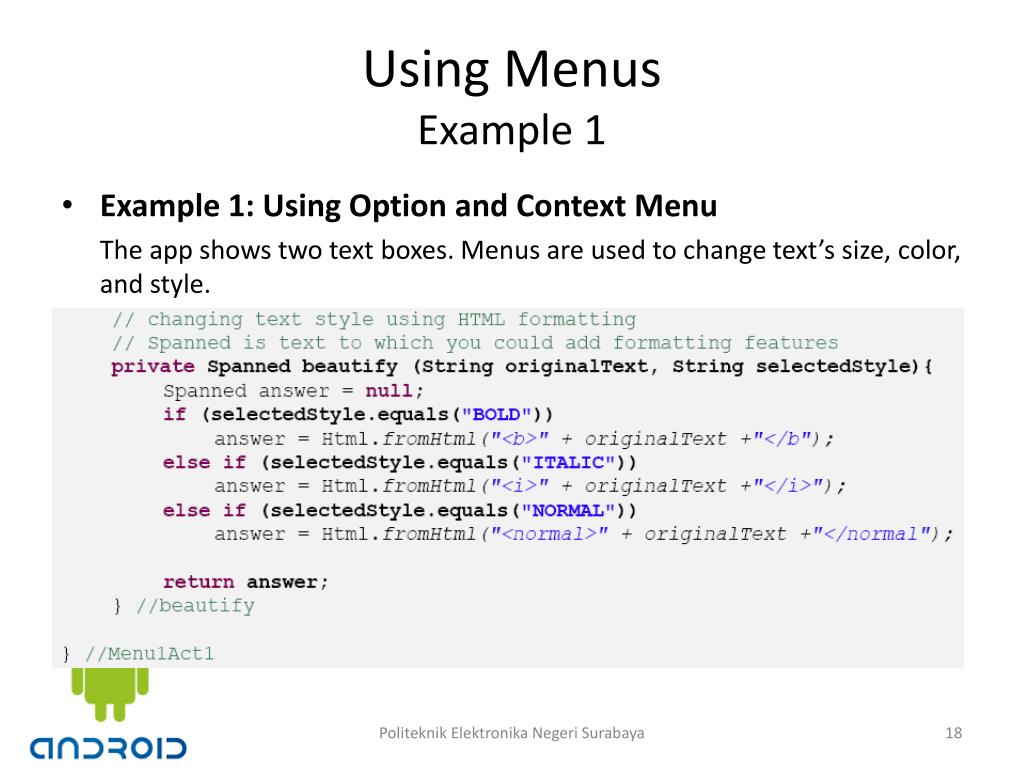Using MenusExample 1 • Example 1: Using Option and Context Menu The app shows two text boxes. Menus are used to change text’s size, color, and style. Politeknik Elektronika Negeri Surabaya