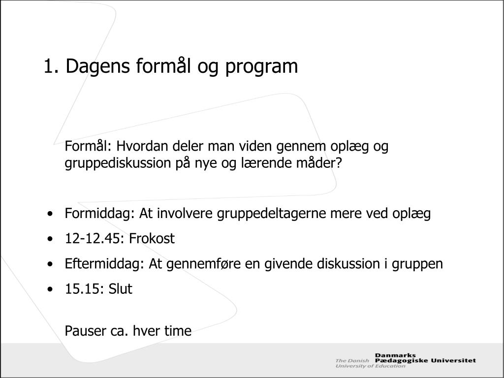 1. Dagens formål og program Formål: Hvordan deler man viden gennem oplæg og gruppediskussion på nye og lærende måder? • Formiddag: At involvere gruppedeltagerne mere ved oplæg • 12-12.45: Frokost • Eftermiddag: At gennemføre en givende diskussion i gruppen • 15.15: Slut Pauser ca. hver time